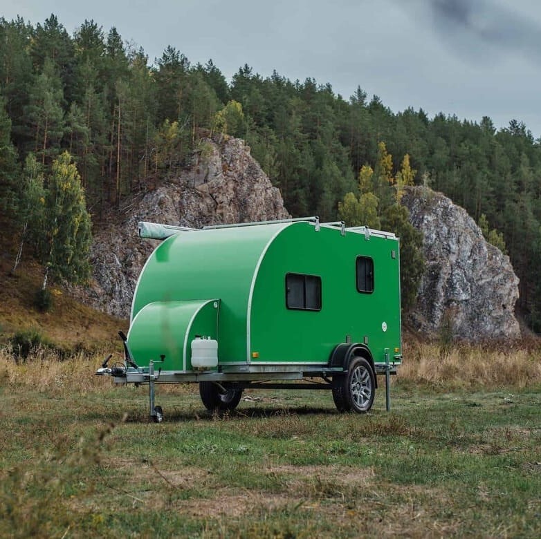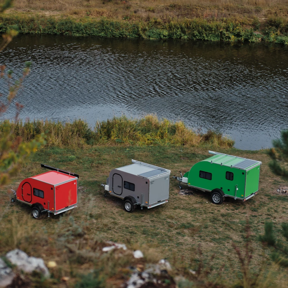 Легкий и компактный прицеп весом от 480 кг, подходит для автомобилей мощностью от 80 л.с. Выполнен из бескаркасных сэндвич-панелей. Влагостойкие материалы отделки. 3 спальных места. Функциональная кухня с модулями хранения. Доступ к кухне снаружи прицепа через заднюю подъёмную крышку.